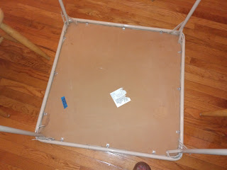 On the other hand, the rips expose the porous cardboard/wood underneath, which invites much more serious water-based damage. So I decided to re-cover the table. It's a really simple repair, actually. Just turn the table over, unscrew the table top from the metal frame,. . .