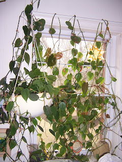 I decided to have a living curtain for this window. The pot hangs on a hook; the vine grows over several tension rods that I scavanged from other windows. |