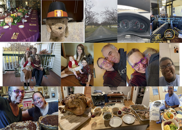 - And Y shows her thanksgiving venue appropriately annotated: "PPE storage corner", "residents slogging away with more than half our patients in for Covid pneumonia", and "hospital cafeteria pumpkin pie, not too shabby". As K-daughter says, "You're so amazing Y! Thank you for all you do!"